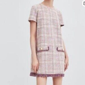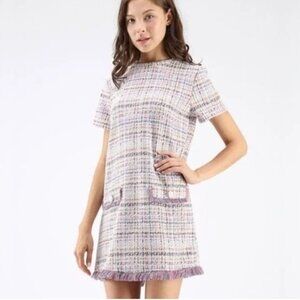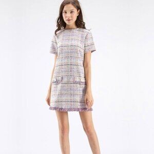 tweed dress, shift dress, mini, multicolor, pastel, lilac, lavender, pink, cream, ivory, blue, plaid, checkered pattern, woven texture, tweed fabric, structured material, short sleeve, straight fit, tailored silhouette, office wear, brunch outfit, preppy, classic, vintage-inspired, elegant, chic, sophisticated, timeless, spring fashion, stylish, polished, feminine