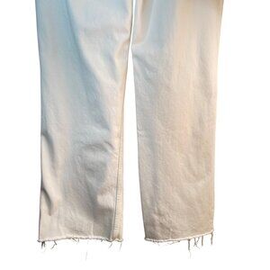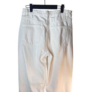 These Zara jeans offer a stylish distressed look with a comfortable fit. Ideal for casual outings, they pair well with various tops and footwear. Zara jeans, distressed jeans, white denim, women's pants, size 8 jeans, casual wear, cotton pants, frayed hem pants, stylish jeans, comfortable jeans, trendy jeans, knee rip jeans, cropped jeans