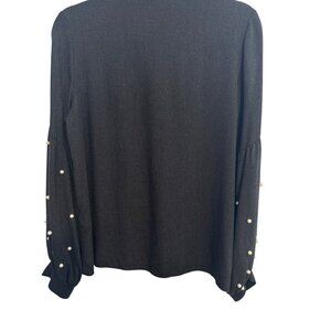 This elegant ZARA deep charcoal top size medium features pearl embellishments beyond the elbows as the sleeves bell out, adding a touch of sophistication. It is ideal for a chic, polished look. Pearls cover both sleeves all the way around, which is unique and great-looking!!