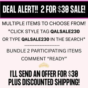 DEAL ALERT! Check out this awesome SALE! BUNDLE THIS ITEM WITH ANOTHER 2/$30 ITEM IN MY CLOSET, COMMENT "READY" AND I'LL SEND $30 OFFER WITH DISCOUNTED SHIPPING! There are MULTIPLE participating items to choose from. To find these items, type QALSALE230 in the search bar on Poshmark or click the QALSALE230 style tag on this listing!