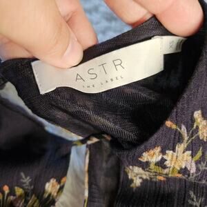 Excellent used condition size XS (extra-small) ASTR the Label Long-sleeved v-neck with keyhole neckline, Back zipper and pearl button at the neckline shorts Romper, lined, dark blue with cream, tan sage, salmon, Lavender flowers. Perfect for spring and summer!