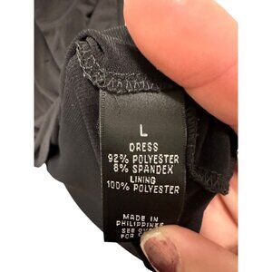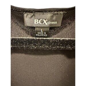 This stunning BCX black cocktail dress (size L) features a daring plunging neckline, gold buckle accent, and handy pockets. Crafted from a blend of polyester and spandex, it's as comfortable as it is stylish.
