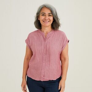 Lightweight, breathable pink blouse with white vertical stripes for a casual and stylish look.