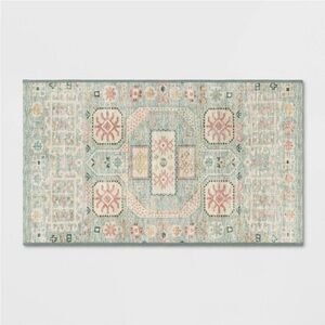 Bring modern charm to your indoor spaces with this Saltwash Accent Rug from Threshold™. The woven area rug features a saltwash distressed pattern on a green backdrop to beautifully accent any room's decor. The latex backing helps keep the rug in place, and since its flat pile height offers easy cleaning, it's ideal for placement in high-traffic areas like your kitchen, living room or entryway.