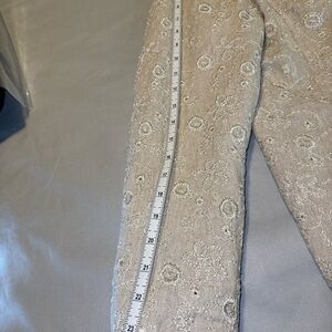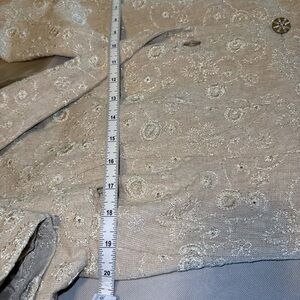 Beautiful embroidered 54% linen 46% cotton blend blazer. Embroidery has a bit of warm silver thread in it for some shimmer.