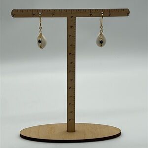 These elegant drop earrings feature a beautiful cream hue accented with gold details, perfect for adding a touch of sophistication to any outfit.