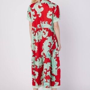 Step out in comfort and style with the Cadenza Summer midi! This soft cotton midi dress features an Amalfi Coast inspired red and seafoam baroque print, a collar, and fringe trim detail for a relaxed and summery look. Perfect for any warm-weather occasion!