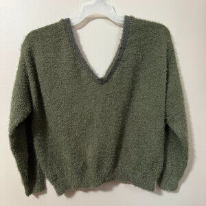 ๐งต #239 Derek Heart Fuzzy V-Neck Twist-Back Sweater | Olive Green Soft Knit