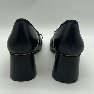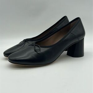 Elegant and timeless, these Mansur Gavriel classic block heels are crafted from premium lambskin leather in a versatile black tone. Designed for comfort and style, they feature a rounded toe, modest block heel, and delicate bow detail.