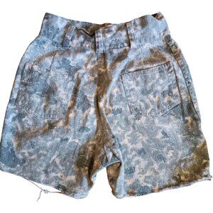 These vintage-style denim shorts feature a unique camouflage pattern, accompanied by a frayed hem that adds a touch of rugged charm. The inclusion of pockets and button details enhances both functionality and style. An ideal choice for those who appreciate a blend of practicality and distinctive fashion sense, adding a touch of nostalgia to any wardrobe.