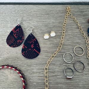 23-pc lot mixed jewelry including bracelets, necklaces, earrings and rings. Also includes one Vera Bradley keychain a few items are in new or like new condition, most are in good preowned condition with minor overall wear. Note - red python teardrop earrings in photo are not included.