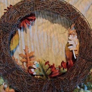 This 24 inch braid is set on a wire base. The foundation is artificial twigs and it is adorned with silk flowers and leaves that are a burgundy brown tan and green hues. It has a hanger at the top for hanging on your front door or anywhere in your home that you want to display this beautiful wreath