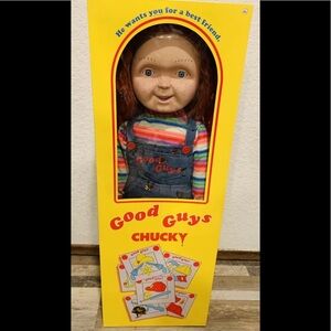 There's nothing creepy about this doll, right? Right? Before he was possessed by the spirit of a serial killer, this Good Guys Chucky doll was waiting for his new friend. Wanna play? Standing 24” tall, you'll be able to pose his arms so he's ready for any kind of game. You can even turn his head so he'll always be looking your way. Add this officially licensed Good Guys static doll to your Chucky collection. After all, every Child's Play fan has to have one! 24”Chucky Child’s Play Doll.New in Original Box.Price is Firm