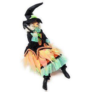 The witch is approximately 24" in height and with positionable arms and legs. The witch has plastic hands and head. The body of the witch is fabric and the arms and legs have bendable wires inside making the witch positionable to best fit your project. The witch can be positioned almost upright or sitting (it will not stand fully upright due to the interior block)