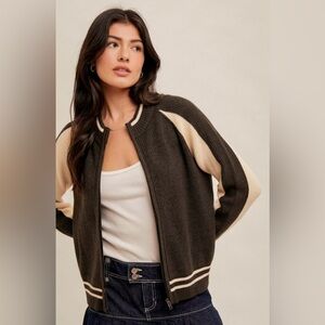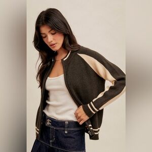 Stylish black and cream cardigan. Features contrasting sleeves. Perfect for layering.
