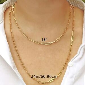 "Enhance your jewelry collection with this trendy 24-inch gold-plated paperclip chain. Featuring a sleek and modern design, this popular style offers a chic, minimalist look perfect for layering or wearing solo. The durable gold plating provides a radiant shine, while its lightweight construction ensures comfortable, all-day wear. A versatile accessory that effortlessly transitions from casual to formal, this chain is a must-have addition to your wardrobe."