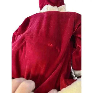 This is in good shape. I did find a couple stains but it is on the back. I just love the look of this Santa! 24 Inch Standing Fancy Santa Claus With Blue Paisley Vest Holding Gift & Wreath