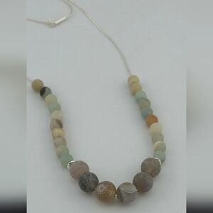 Beautifully handmade by a Miami jewelry artist, this 24" boutique necklace showcases natural stone beads in calming earth tones, strung on a genuine 925 sterling silver chain. The cracked agate center beads create visual texture, gradually transitioning to smoother round natural stones. Finished with a sleek barrel clasp and sterling silver spacer accents, this minimalist piece blends organic charm with everyday wearability.