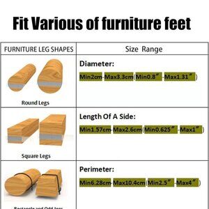 Our Silicone chair feet leg covers are suitable for leg size :Round Leg Diameter:20-33mm(0.8-1.3IN);Side Length of Square Leg:15.7-26mm(5/8-1 IN),Suitable the perimeter of rectangles and other irregular legs:62.8-104mm(2.5-4IN)