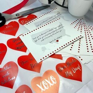 Stickers are 2.5 - 3” XL deluxe heart shapes w encouraging messages written in silver foil.
