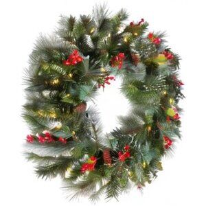 Festive Design: This 24-inch pre-lit Christmas wreath features a wintry pine branch base, decorated with frosted branches, pine cones, and berry clusters, adding a natural and festive touch to your holiday décor.