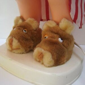 He wears a pair of cute bear slippers and a striped nightgown
