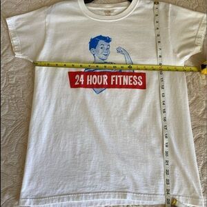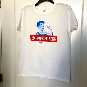 This limited addition 24 hour fitness unisex T-shirt in 100% cotton size medium. Without tags but never been worn bright white T-shirt with cool vintage logo.