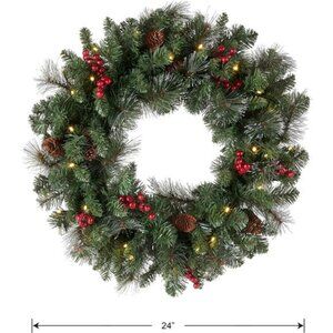 🧿Designed with a Crestwood Spruce branch base, this pre-lit artificial Christmas wreath is 24 inches wide and decorated with pine cones, berry clusters and frosted branches.