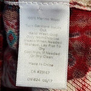 Talbots pullover sweater featuring a crewneck, back keyhole and button closure, slight puff sleeves with fitted cuffs, and a soft, fairly lightweight 100% merino wool fabrication in a beautiful Moroccan-inspired paisley in red with turquoise, white and dark purple accents.