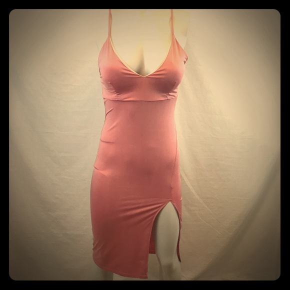 Pink side slit midi Bodycon dress, lightly padded plunging neckline, crosses spaghetti straps