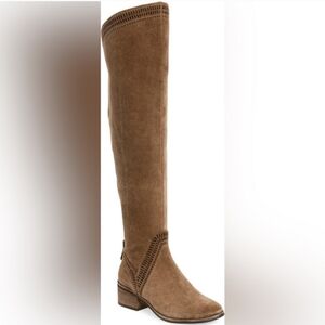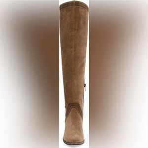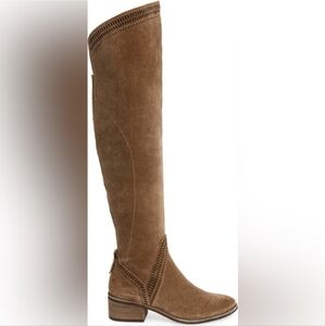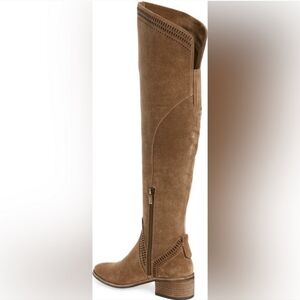 Stylish heeled boots Karinda Over the Knee Boots by Vince Camuto. Dark brown color. Elegant design with textured details.