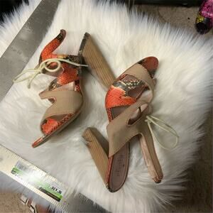 Tracy Reese Plenty offers these stylish orange slingback heels, perfect for party or cocktail occasions. Crafted from leather with snake print canvas accents, they feature a pointed toe and a cone heel. The lace-up closure adds a unique touch, suitable for spring wear. These pre-owned heels are in good condition.