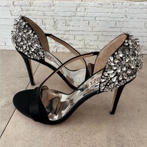 $245 EUC Badgley Mischka Pauline Black satin with Silver Embellished Heels Sz 8