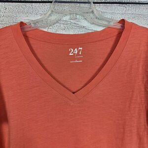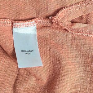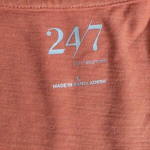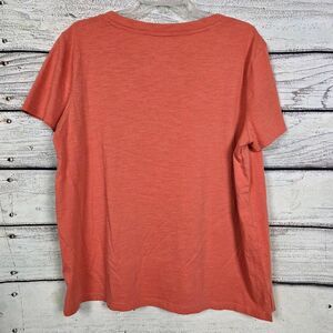 24/7 by Maurices women’s solid coral short sleeve tee, size Large. Made from 100% cotton for lightweight breathability. Features a classic V-neckline and side slits for a relaxed, easy fit. Perfect for casual or layered looks.
