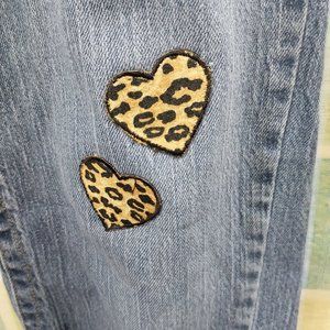 2477 Jeaniemade Size 10 Cato Turning Seams Upcycled Jeans. The seams on the legs are sewn to swirl around the legs. Waist 17" length 32.5" rise 9"'.