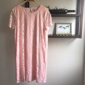 Adorable and versatile Juicy Couture Light Pink / Peach Crochet Knit Lace Shift Mini Dress—no tags, but never worn so like new / NWOT. Dress is lined with short sleeves.