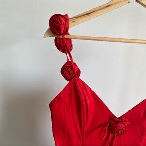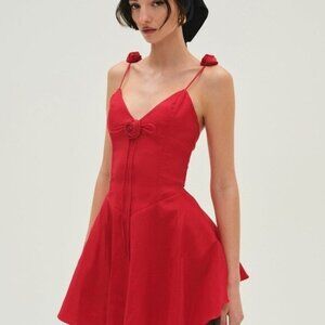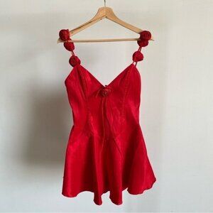 This striking red mini dress by For Love And Lemons boasts a sweetheart neckline with delicate spaghetti straps, perfect for a cocktail night out. Its structured fabric and flared skirt create a playful and chic silhouette, making it an eye-catching choice for any special occasion. Love the rose embellishments!! Back zip closure. Boning for structure.