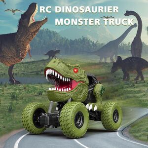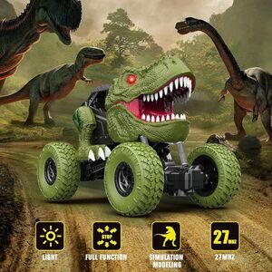 Super Cool Remote Control Dinosaur Car: This distinctive RC Dinosaurs Monster Truck, remote controls that move the cars forward and backward left, The remote control dinosaur truck has dinosaur and racing toy functions, The dinosaur truck has the look of a violent tyrannosaurus. the flashing LED headlights effect vivify this RC truck while playing indoors and outdoors.