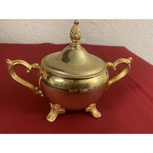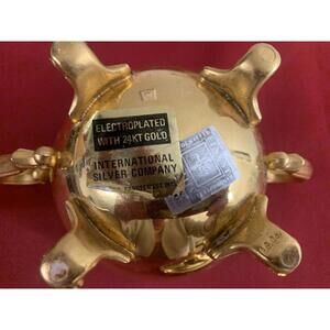 This International Silver Co. 24K gold electroplated creamer and sugar bowl set is a striking example of mid-century decorative tableware. The footed bases, elegant double handles, and detailed pineapple finial add a regal look to any setting. These pieces make an excellent gift, collectible, or statement piece for vintage dining décor