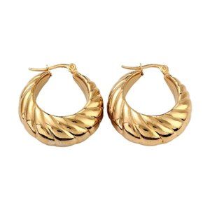 24K Gold Plated Rib Lined Hoop Pierced Post Earrings 32mm Long Thick Band Stainless Steel