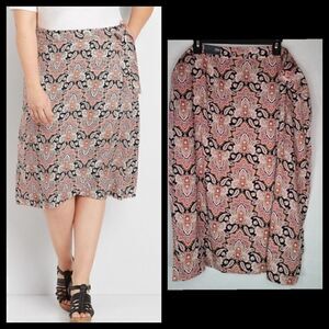24W Boho Pink Paisley Wrap Skirt Midi Lightweight Maurices NWT, plussize, flowy woven fabric, inside button closure with tie waist, high rise, mid length, unlined. Measurements approximately waist to hem 31" waist across 24" band width 1.5" weight 13oz