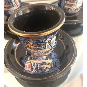 24k Gold Greek Krete Demistasse Teacups & Saucer Handmade in Greece Black/ Gold. Set 5 teacups & saucers. Excellent Condition!