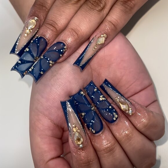 This set of 24 nail stickers comes with a nail scraper and a small container of jelly glue. The stickers are coffin-shaped and have a butterfly and flower design.