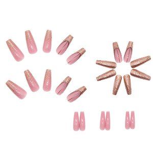 24pcs Pink Long Coffin Fake Nails With Golden Glitter Design