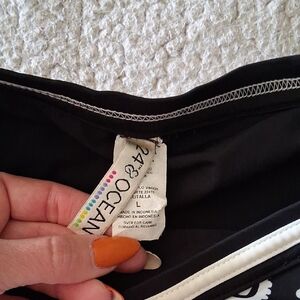 Elegant black and white swim skirt. Features intricate patterns. Perfect for beach outings. Excellent condition.