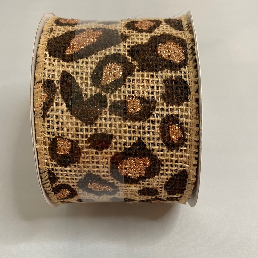 New 2.5 Inch x 21 feet Wired Leopard Print Ribbon is burlap with leopard print.