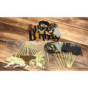 A professionally crafted cake decoration set featuring wizard-themed elements for birthday celebrations. Designed with intricate glitter details and iconic magical motifs, this topper elevates cake presentation with stylish flair.