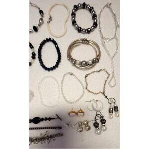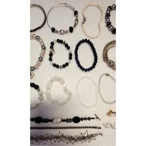 25+ Pc Costume Jewelry Lot Bracelets Earrings Black White Clear. Mostly stretch bracelets, 1 slave bracelet, 1 ankle bracelet. Materials are gemstones, glass, rhinestones, faux? pearls, memory wire, enamel.