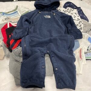 Minor stains on a couple of items. A blanket, hat, bib. Long/short sleeve onesies. Pants, shorts.