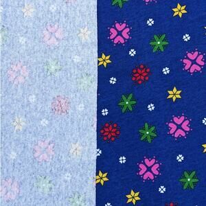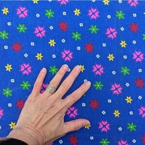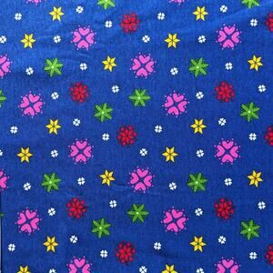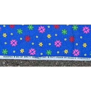 Pretty knit fabric by Rosstex/Brett designed by Angela Fernandez vintage 1980's or 1990's. Geometric fabric is deep cobalt blue with fun multicolor shapes - hearts or stars or snowflakes with tiny white flowers in between. In very good vintage condition overall - has a misprint along the selvage & a small ragged hole near the edge (last 2 pics).